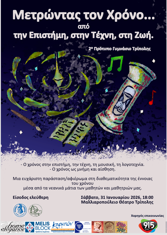 2ο Πρότυπο Γυμνάσιο Τρίπολης – Θεματική εκδήλωση – Σάββατο 31-01-2026 – 18:00 μμ – Μαλλιαροπούλειο Θέατρο – “Μετρώντας το χρόνο… από την Επιστήμη, στην Τέχνη, στη Ζωή”